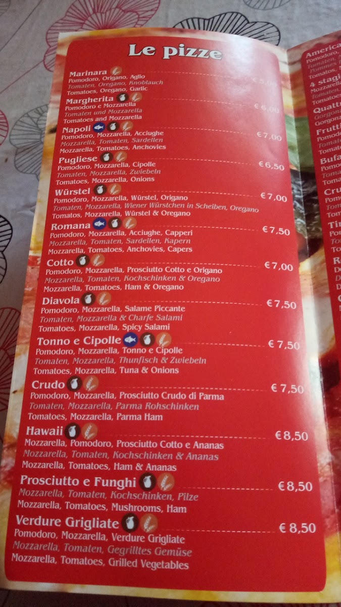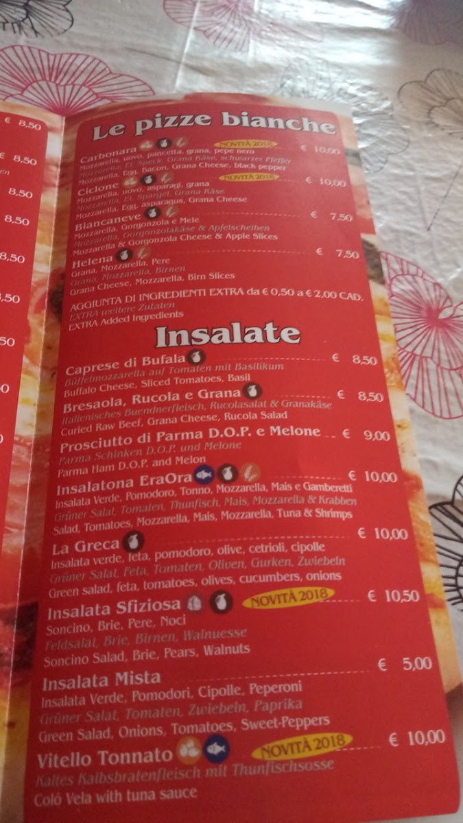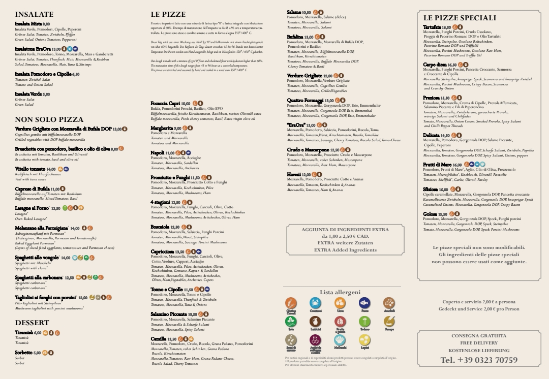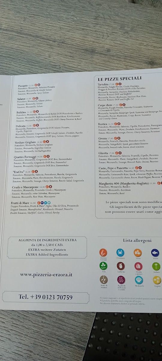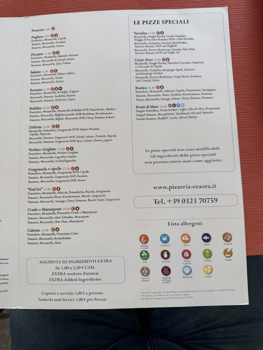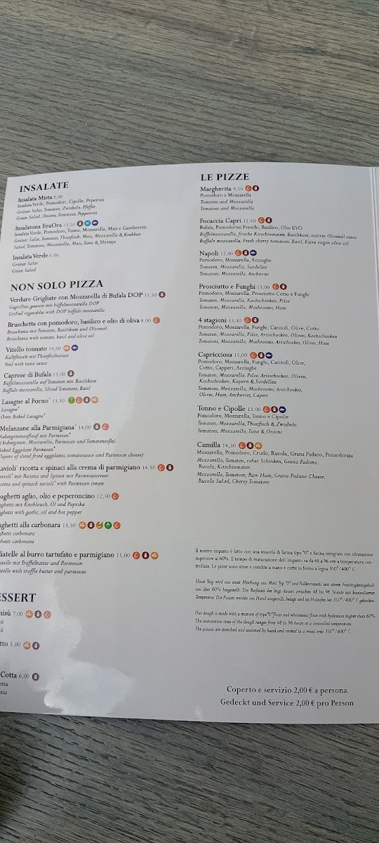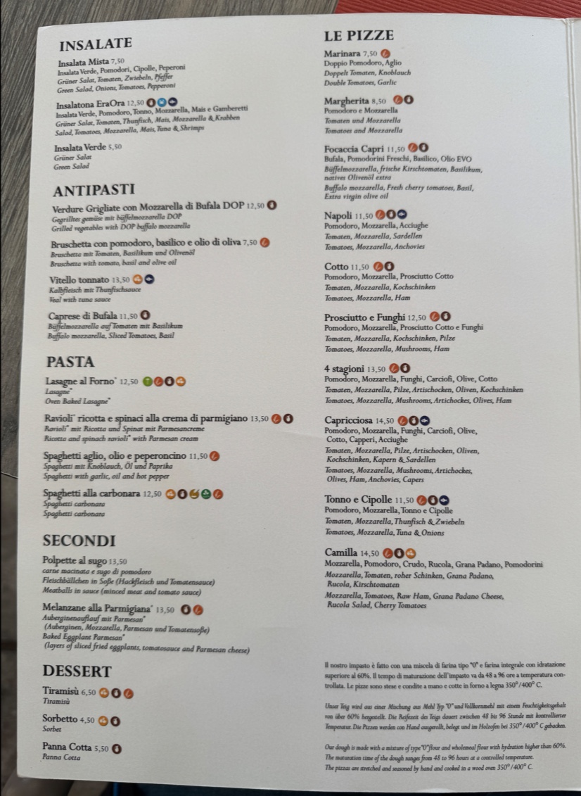 The menu at Pizzeria Eraora in Cannobio offers a delightful range of Italian classics, each crafted with attention to detail and flavor. Among the standout dishes, Tiramisu is a must-try, offering the perfect blend of coffee-soaked ladyfingers and creamy mascarpone, leaving a rich and satisfying taste. For pizza lovers, the Pizza Vier Jahreszeiten brings a delicious combination of toppings, while the Meeresfrüchte Pizza is a seafood lover's dream, featuring fresh ingredients straight from the sea. Pizza Camilla is another great option, with its perfectly balanced toppings making it a crowd favorite.
